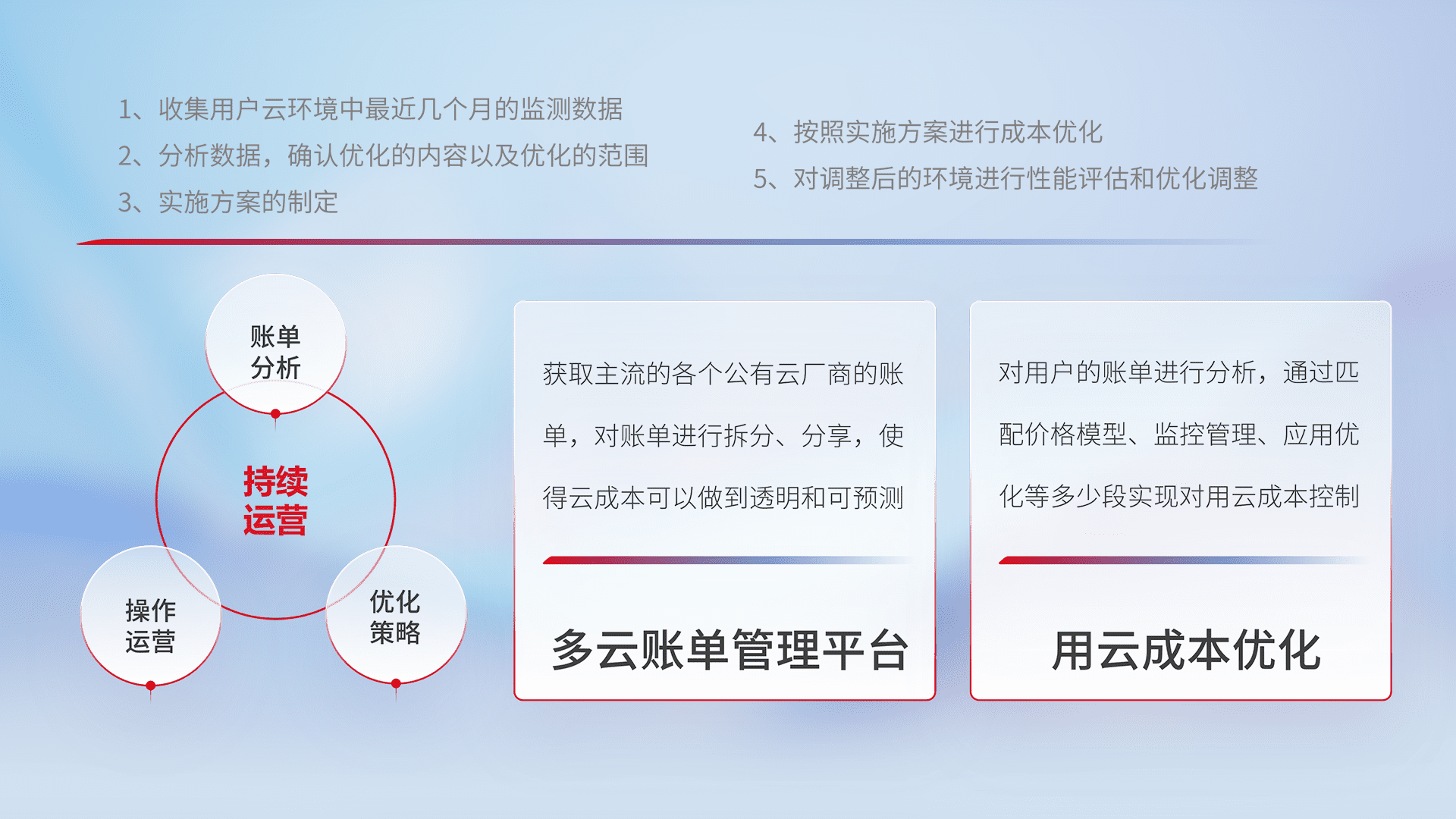 通过多云纳管,,,,以统一的资源数据模型把客户的云资源进行抽象和封装,,进而实现对多云资源的统一操作,,保障云资源管理的可靠性、、、、稳定性与可用性。。。量身定制化运维内容,,,,配置、、开发运维、、、、补丁管理、、备份、、、、监控、、认证和访问管理、、审计和日常巡检等,,保障在用云过程中的可靠度,,,稳定度以及高可用率。。。